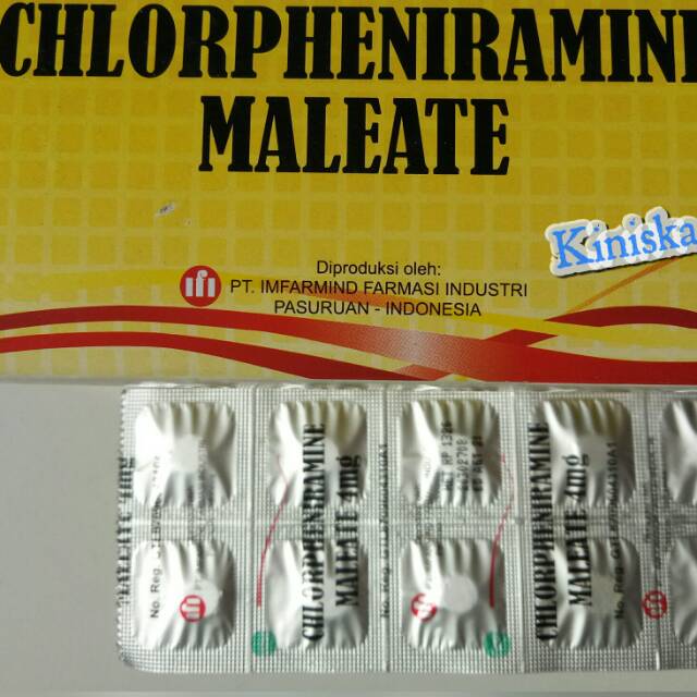 Chlorpheniramine maleate termasuk dalam kelompok obat yang disebut antihistamin. Kombinasi Obat Chlorphenamine Maleate Methylprednisolone dan Vitamin C untuk Gatal-Gatal Chlorphenamine Maleate Penggunaan. Chlorphenon adalah obat yang digunakan untuk mengobati pilek bersin-bersin mata berair gatal pada mata hidung tenggorokan atau kulit yang disebabkan oleh reaksi alergi common cold atau influenzaObat ini juga bisa digunakan untuk mengobati rinitis alergi urtikaria dan hay feverChlorphenon mengandung Chlorpheniramine maleate obat antihistamin generasi pertama.